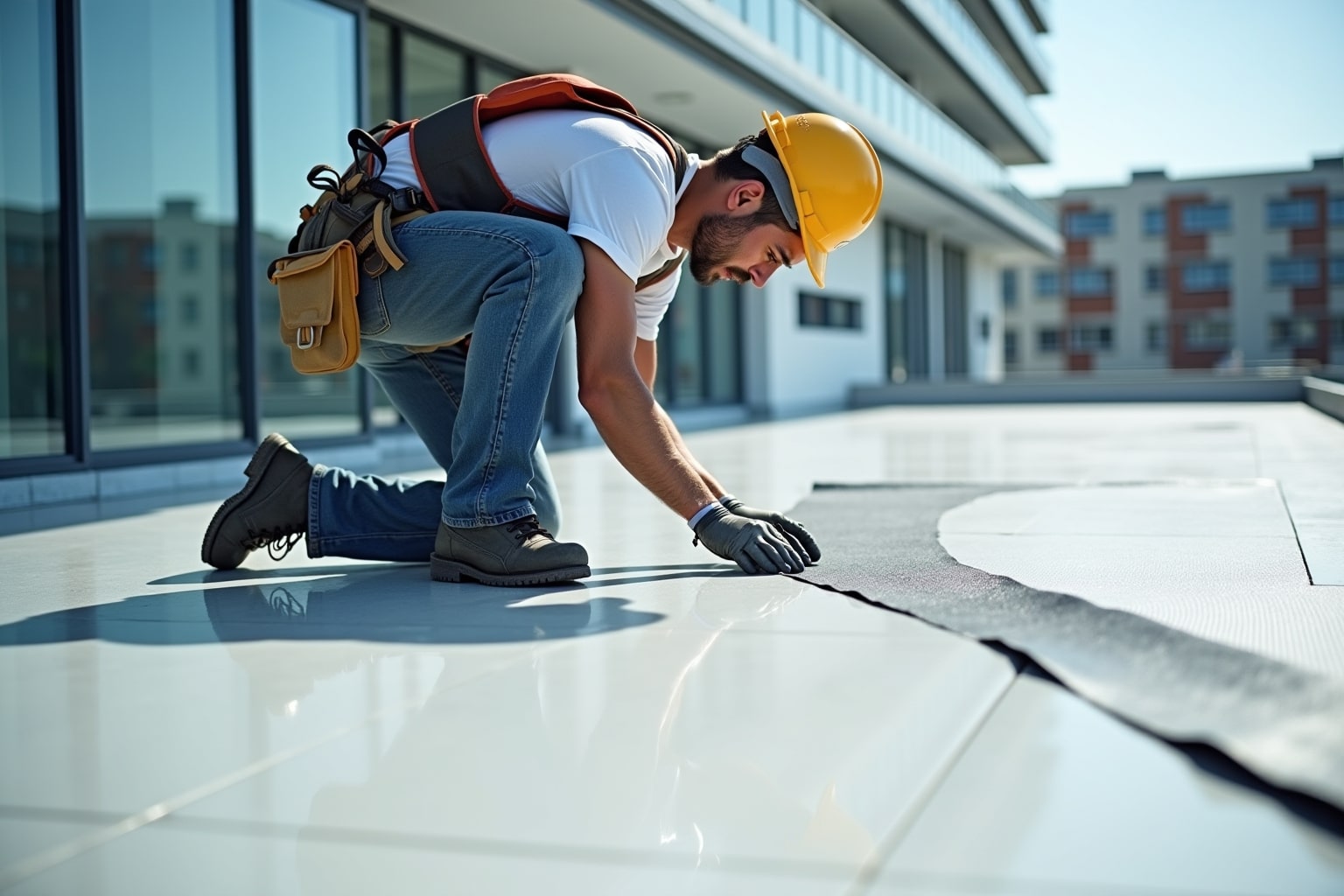 Nach der Vorbereitung kann die neue Dachabdichtung angebracht werden. Je nach Material werden Bitumenbahnen verschweißt, Kunststoffbahnen verklebt oder Flüssigkunststoff aufgetragen. Achte darauf, dass die Abdichtung fachgerecht und sorgfältig ausgeführt wird.