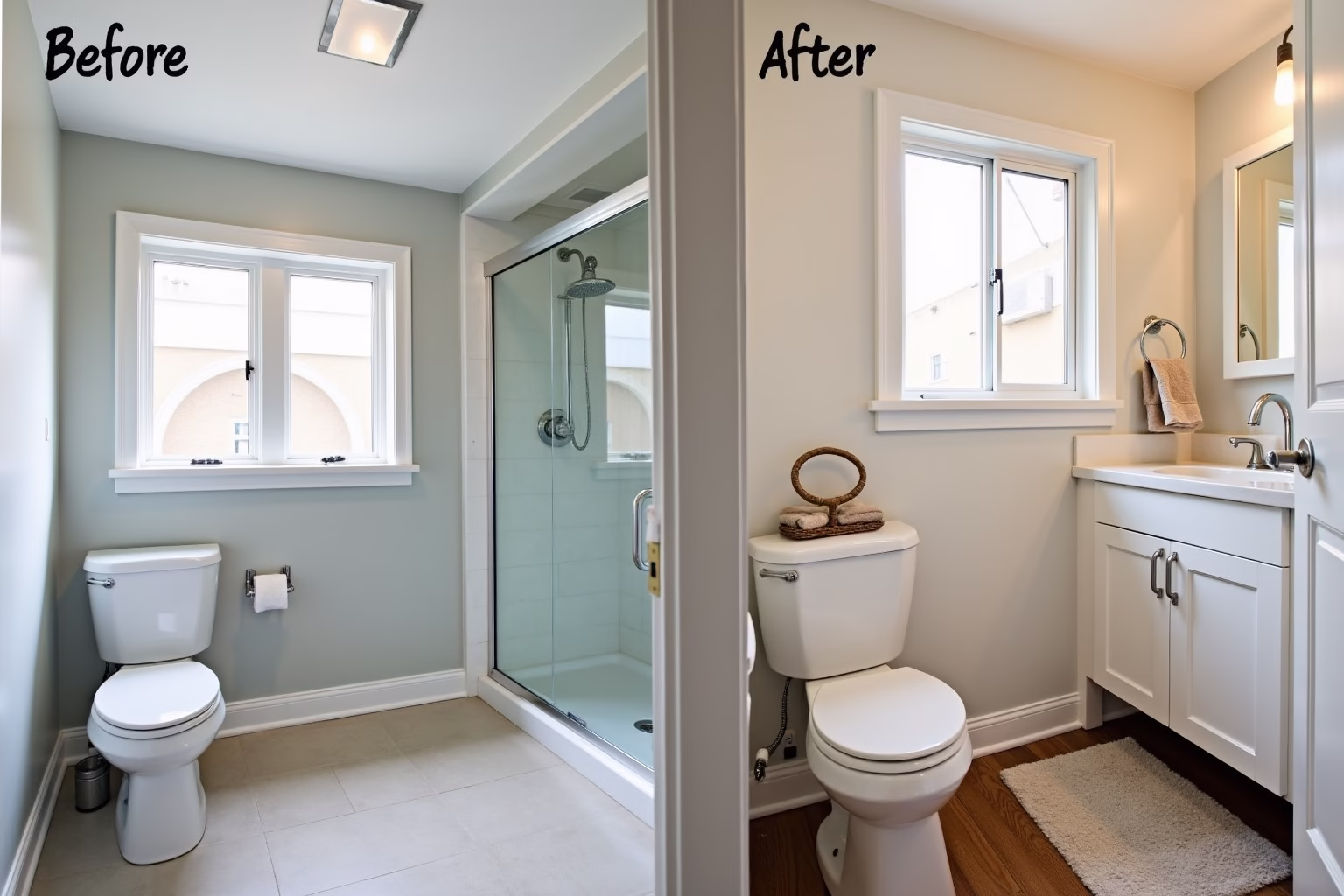 Beispiel 1: Ein dunkles, ungemütliches Bad verwandelt sich in eine helle, freundliche Wohlfühloase. Durch den Einsatz von hellen Farben, einer modernen Dusche mit Glastrennwand und cleveren Stauraumlösungen wirkt der Raum deutlich größer und einladender.